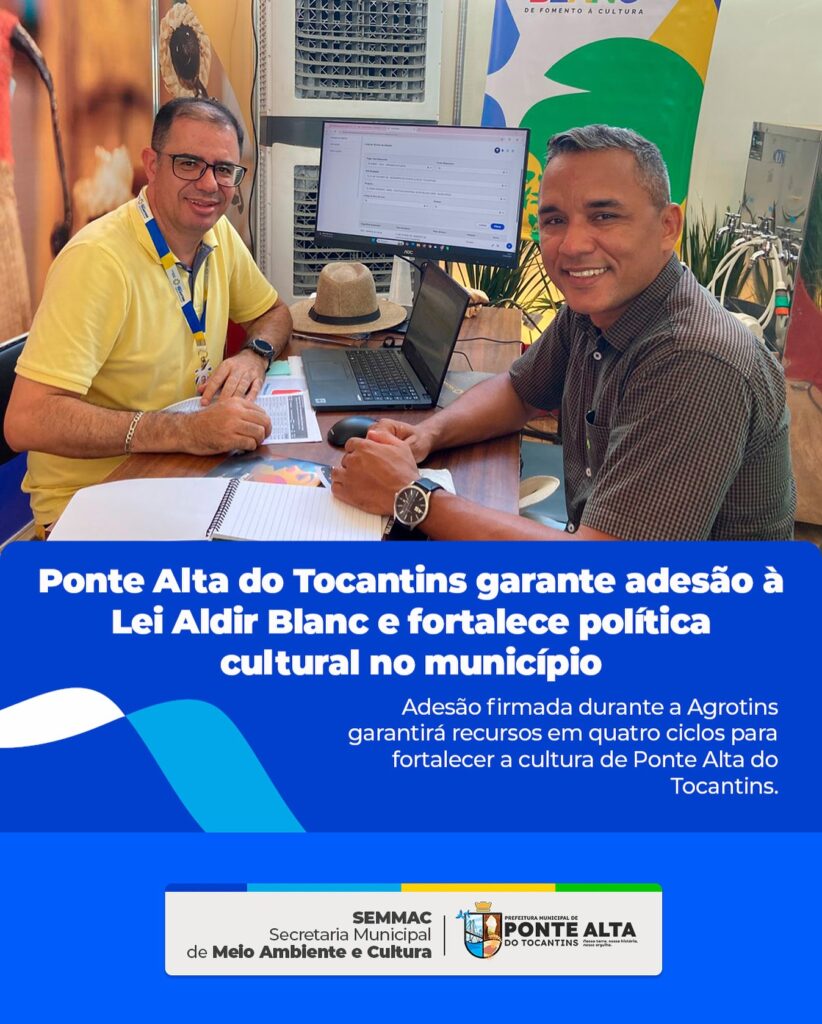 A Secretaria Municipal de Meio Ambiente e Cultura de Ponte Alta do Tocantins garantiu a adesão à nova fase da Lei Aldir Blanc, política nacional de fomento à cultura, que beneficiará o município com investimentos em quatro ciclos de repasses.