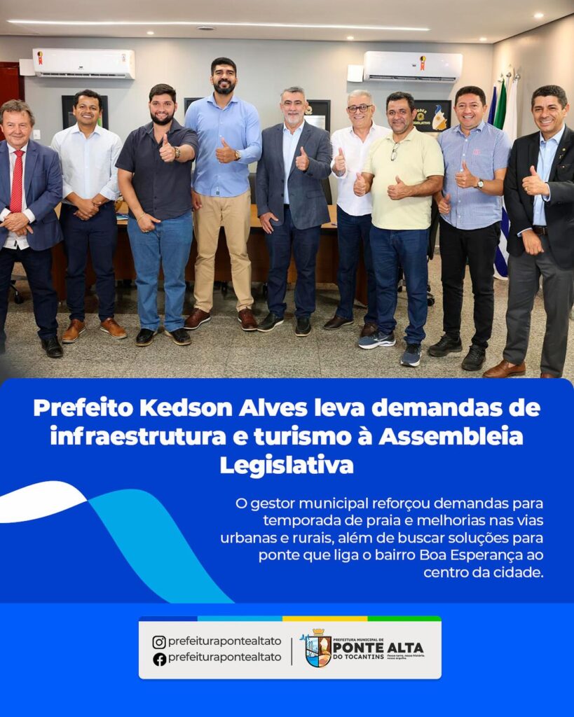Em visita à Assembleia Legislativa do Tocantins, o prefeito de Ponte Alta do Tocantins, Kedson Alves, participou de uma importante reunião no gabinete do presidente da Casa, deputado estadual Amélio Cayres. O encontro contou com a presença do secretário de Turismo, Hercy Filho, do deputado estadual Valdemar Júnior, prefeitos de outras regiões e lideranças políticas.