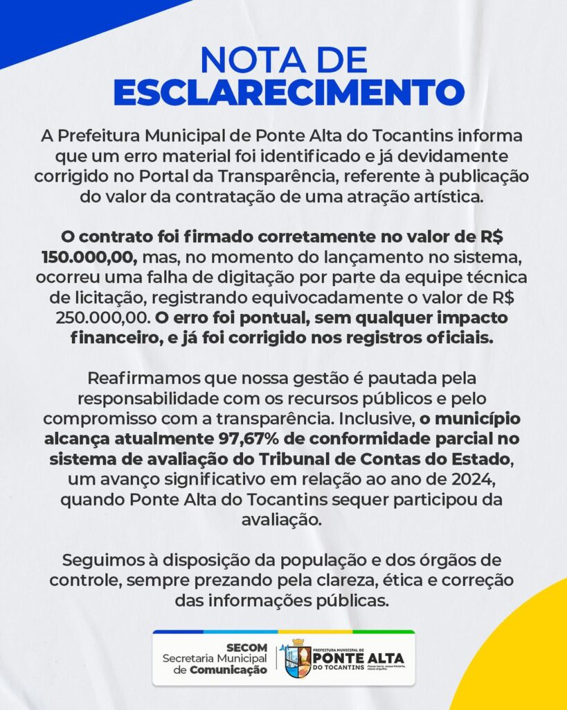 A Prefeitura de Ponte Alta do Tocantins informa que um erro de digitação no Portal da Transparência já foi identificado e corrigido. O contrato da atração artística foi firmado corretamente no valor de R$ 150.000,00, mas, por falha no lançamento do sistema, constou de forma equivocada o valor de R$ 250.000,00.