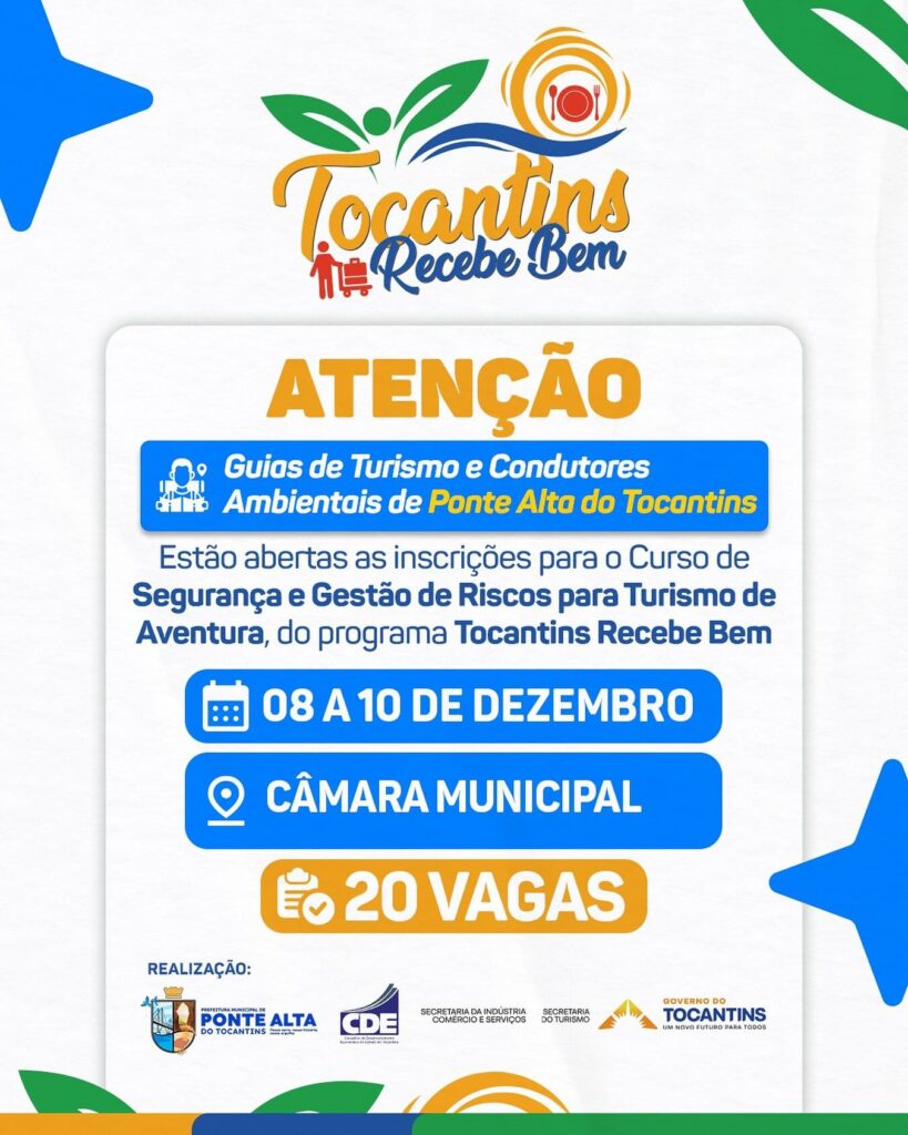 Ponte Alta do Tocantins está com inscrições abertas para o Curso de Segurança e Gestão de Riscos para Turismo de Aventura, pelo programa Tocantins Recebe Bem!