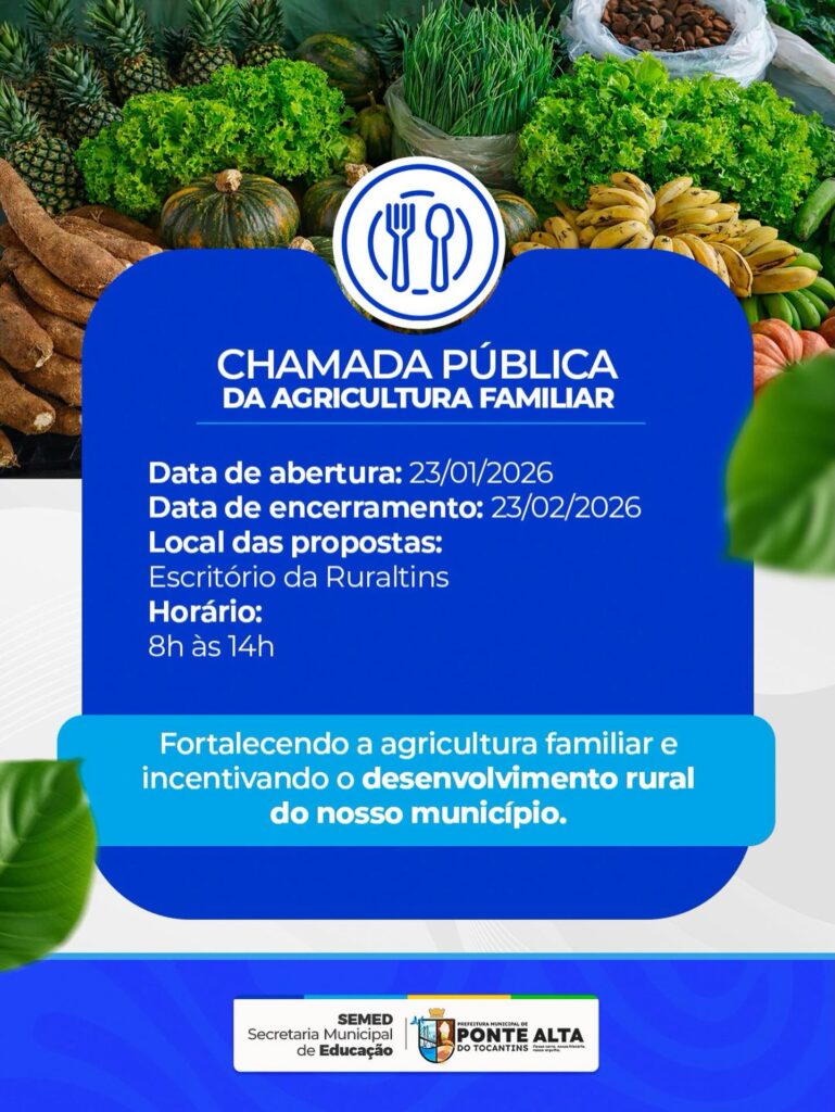 A Prefeitura Municipal de Ponte Alta do Tocantins, por meio da SEMED, informa que está aberta a Chamada Pública da Agricultura Familiar, fortalecendo quem produz e movimenta a economia do nosso município.