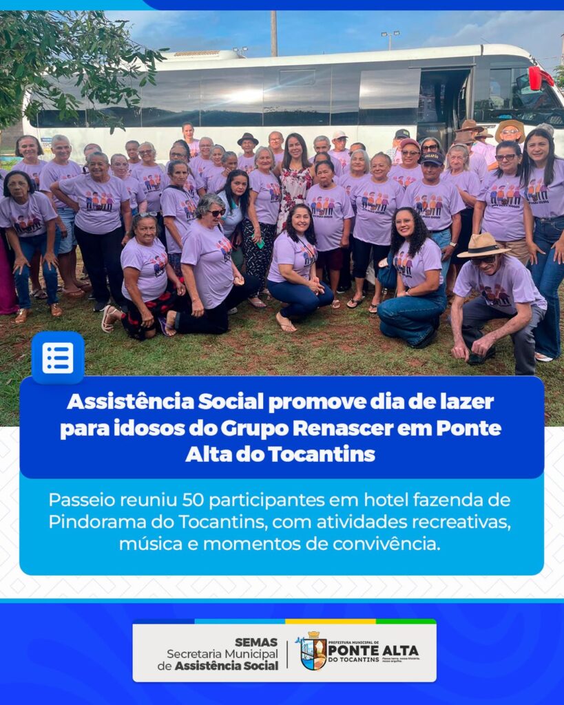 A Secretaria Municipal de Assistência Social promoveu um dia especial de lazer para os idosos do Grupo Renascer, em Ponte Alta do Tocantins. A ação reuniu participantes do Serviço de Convivência e Fortalecimento de Vínculos (SCFV) em um momento de integração, diversão e fortalecimento dos laços de amizade.