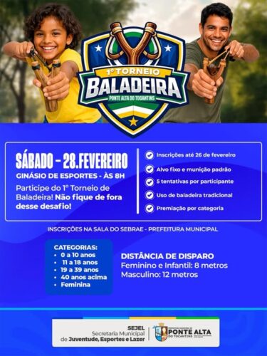 Vem aí o 1º Torneio de Baladeira de Ponte Alta do Tocantins! Sábado | 28 de fevereiro Às 8h Ginásio de Esportes Mostre sua pontaria e participe desse grande desafio! Alvo fixo e munição padrão 5 tentativas por participante Premiação por categoria Inscrições até 26 de fevereiro, na Sala do Sebrae – Prefeitura Municipal. Chame… Continue lendo 1° TORNEIO DE BALADEIRA