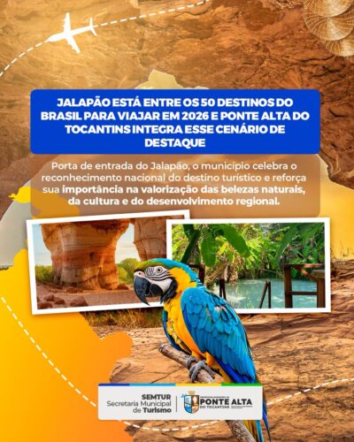 O Jalapão foi incluído na lista dos 50 destinos imperdíveis do Brasil para viajar em 2026, consolidando ainda mais o Tocantins no cenário do turismo nacional. Como principal porta de entrada para essa região que encanta visitantes do mundo inteiro, Ponte Alta do Tocantins também celebra esse importante reconhecimento. O município tem papel fundamental na… Continue lendo JALAPÃO ENTRE OS 50 DESTINOS DE 2026; PONTE ALTA EM DESTAQUE