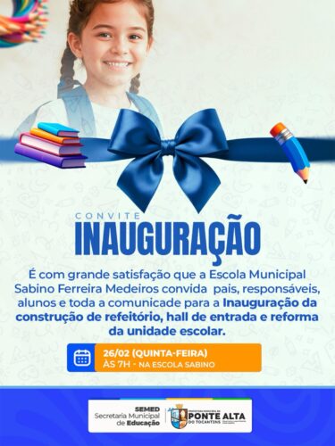 A Escola Municipal Sabino Ferreira Medeiros está ainda mais preparada para receber nossos estudantes! A Prefeitura de Ponte Alta do Tocantins concluiu a reforma da unidade, ampliando vagas e reforçando o compromisso com uma educação de qualidade, confortável e segura para toda nossa comunidade escolar. Essa conquista representa mais oportunidades para crianças e jovens aprenderem,… Continue lendo ESCOLA RECANTO DO SABER RECEBE AMPLIAÇÃO E REFORMA EM PONTE ALTA