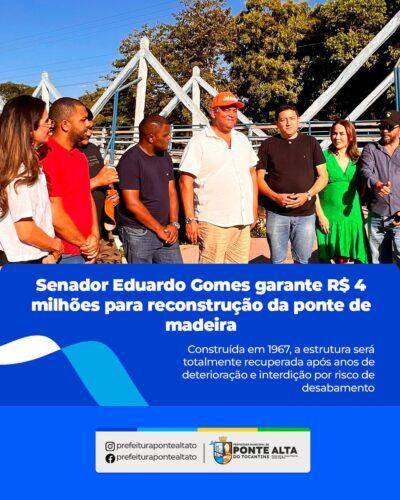 No último domingo (31), o senador Eduardo Gomes (PL-TO), vice-presidente do Congresso Nacional, esteve em Ponte Alta do Tocantins para anunciar a destinação de R$ 4 milhões para a reconstrução da histórica ponte de madeira sobre o Rio Ponte Alta, interditada desde fevereiro deste ano por risco de desabamento. A visita contou com o prefeito… Continue lendo Sem título