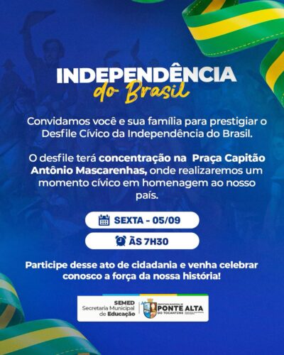 Hoje, vamos juntos celebrar a Independência do Brasil em um grande Desfile Cívico! Concentração na Praça Capitão Antônio Mascarenhas Às 7h30 Traga sua família e participe desse momento de cidadania, união e amor pelo nosso país.