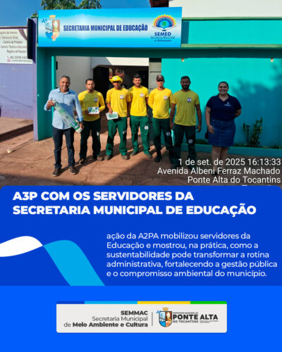 A3P em Ação: Sustentabilidade e Cuidado Integral na Secretaria Municipal de Saúde de Ponte Alta – TO 🌿♻️ A Prefeitura Municipal de Ponte Alta do Tocantins, por meio da Secretaria Municipal de Meio Ambiente, promoveu uma ação formativa da Agenda Ambiental na Administração Pública (A3P) com os servidores da Secretaria Municipal de Saúde, fortalecendo a… Continue lendo Ponte Alta do Tocantins integra sustentabilidade às práticas da Saúde com ação da A3P