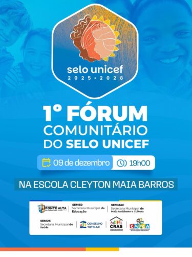 Ponte Alta do Tocantins avança na construção de políticas públicas para nossas crianças e adolescentes! Na terça-feira (09 de dezembro) acontece o 1º Fórum Comunitário do Selo UNICEF 2025–2028, um grande momento de diálogo, escuta e construção coletiva.O encontro será às 19h, na Escola Cleyton Maia Barros. Vamos juntos transformar o futuro da nossa cidade!